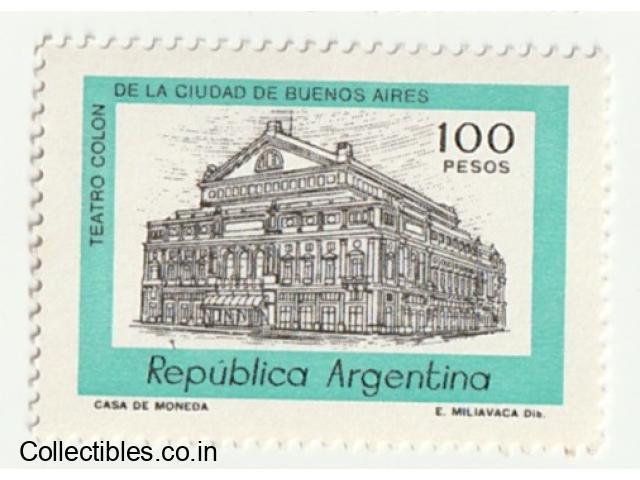 This postage stamp is of Republica Argentina and officially now Argentina and is of the year 1978 estimated. The stamp has a face value of 100 p ( Pesos).The stamp has NOT BEEN USED considering NO SEAL mark visible on it. The physical condition of the stamp is GOOD well centered and aligned to margins.The shape of the stamp is regular... The stamp is classified in (Structure - Building) category as it mentions "Teatro Colón, a famous opera house in Buenos Aires, Argentina" along with - "DE LA CIUDAD DE BUENOS AIRES,TEATRO COLON , REPUBLICA ARGENTINA, CASA DE MONEDA, E. MILIAVACA DIB.".