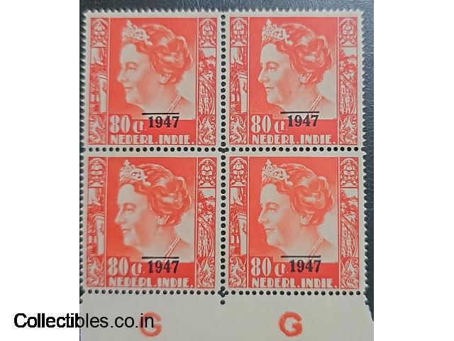 Dutch Occupation of East India / Indonesia Queen Wilhelmina overprint 1947 / 80 Dutch cents. Photogravure printing. Mnh block of 4